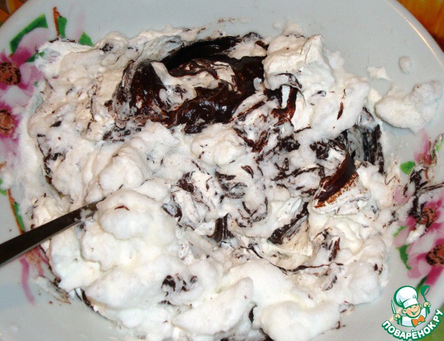 В остывший шоколад положить половину белка и сливок.