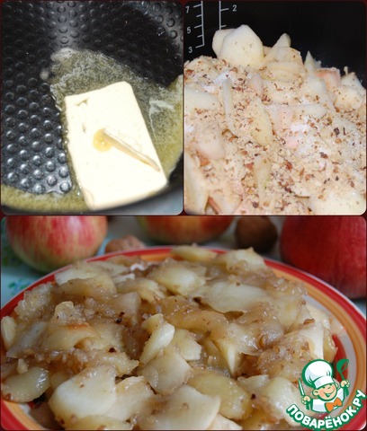 В чаше мультиварки растопить 50 г сливочного масла, добавить туда яблоки, орехи и сахар. Протушить яблоки до мягкости, выпарить лишнюю жидкость. Выключить мультиварку, переложить в миску и слегка остудить начинку.