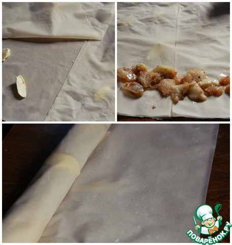 На лист фило выложить по маленькому кусочку масла, накрыть вторым листом фило и так-же выложить кусочки масла. Накрыть третьим листом. На край листа выложить 1/4 часть яблочной начинки. Свернуть в рулет. Проделать данную операцию 4 раза. У вас получится 4 рулета.