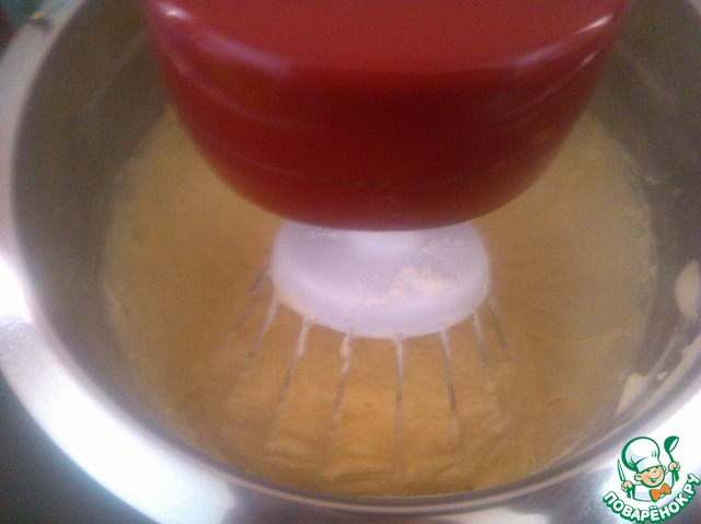 Отдельно смешать муку с разрыхлителем и аккуратно вмешать в жидкую часть, можно перемешать миксером. Разогреть духовку до 180 градусов.