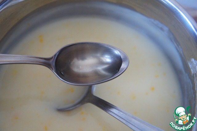 Смешать крахмал, соль и сахар (примерно 1/3 стакана) в кастрюле. Помешивая добавить холодное молоко с соком и цедрой. Поставить на огонь и варить на среднем огне, помешивая, пока смесь не загустеет и не закипит. Оставить на маленьком огне, постоянно помешивая, 1 минуту.