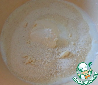 Смешиваем манную крупу, сметану и кефир. Оставляем на 30 минут.