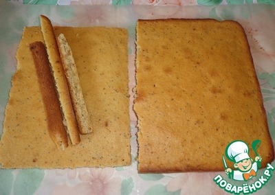 Даем немного остыть нашему коржу. Затем разрезаем его пополам. Обрезаем по бокам. Из обрезков сделаем крошку для обсыпания торта.