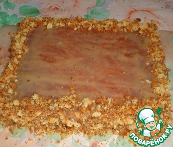 Торт полностью смазываем сгущенкой. Бока посыпать крошкой. Верх оставить пустым.