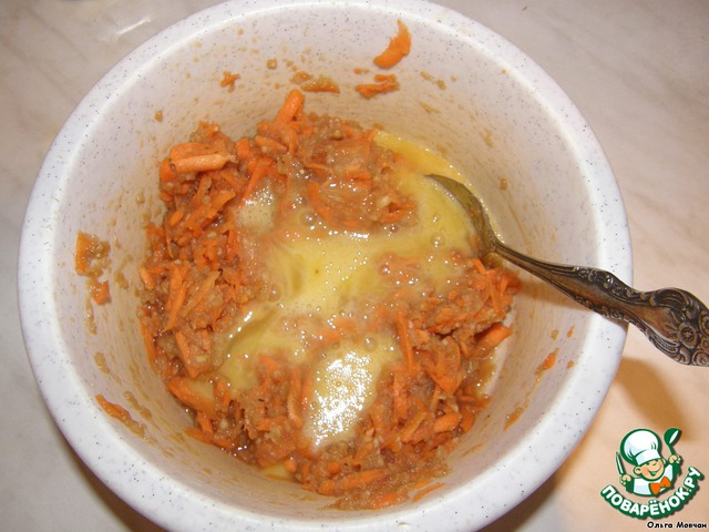 Добавляем яйца к смеси моркови и фруктов. Перемешиваем.