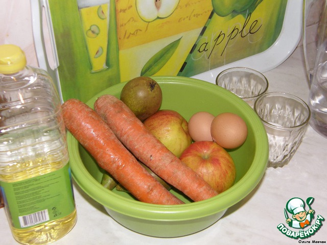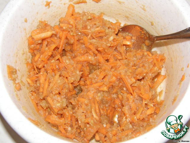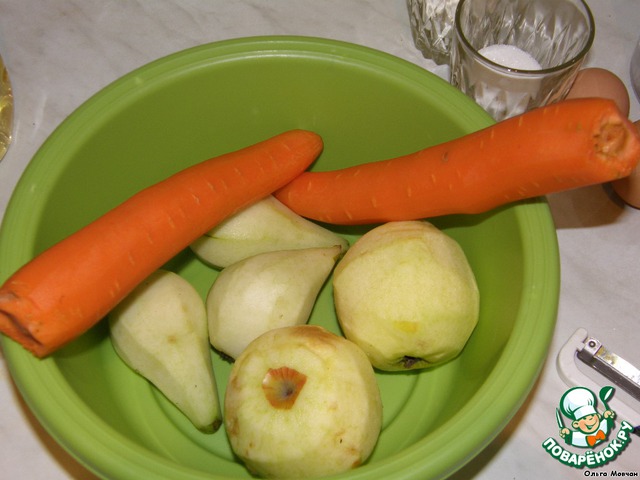 Пропустим фрукты через мясорубку или же натрём на тёрке. Морковь натираем на терке. Все это смешиваем.
