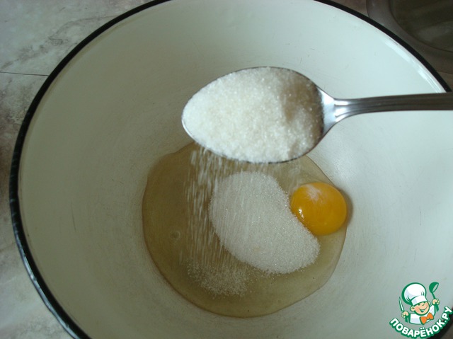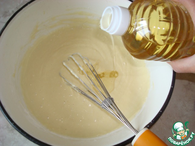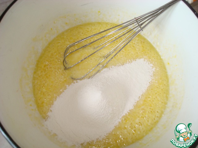 Добавляем просеянную муку и замешиваем тесто (его взбивать не нужно). тесто должно быть как густая сметана