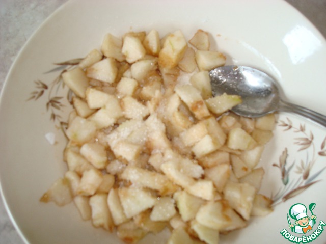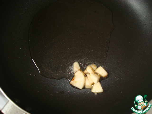Пока оладьи пекутся, готовим чай из яблочных остатков: складываем их в кастрюльку.