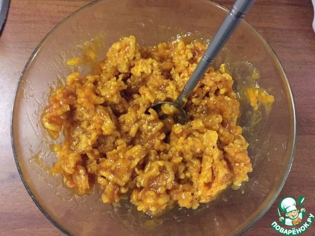 Готовим начинку: курагу перекручивание на мясорубке, смешиваем с вареньем