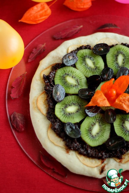 Достанем готовую пиццу. Намажем соус. Выложим порезанные фрукты. Яблоки, киви и виноград выбраны не случайно, именно осенью созревают эти фрукты в Италии. Всё! Десертная пицца готова.