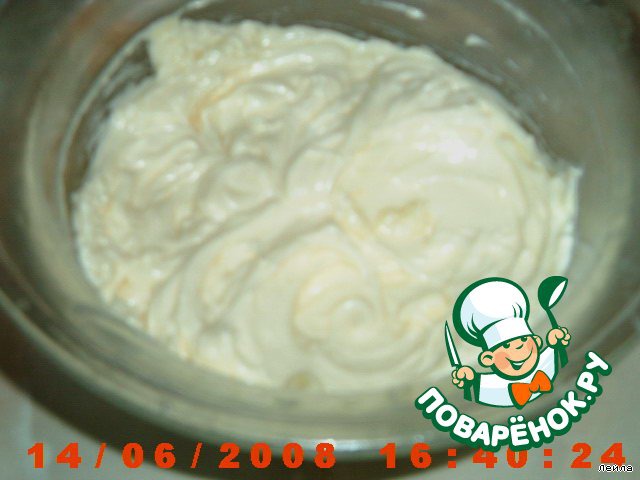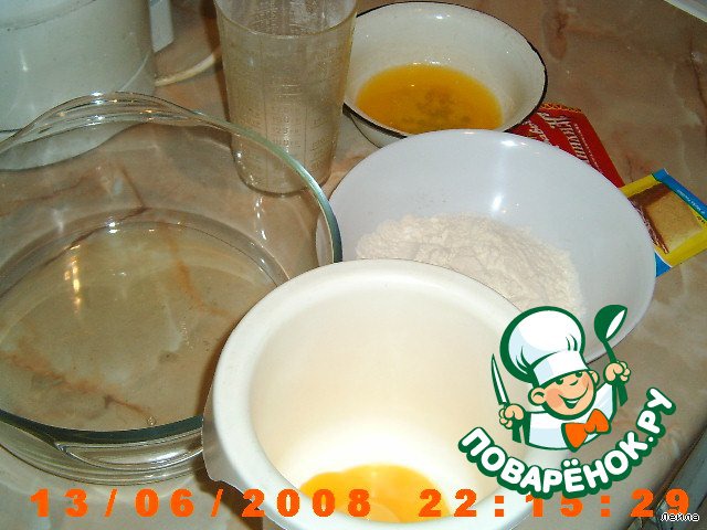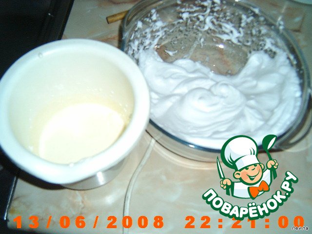Отделяем белки от желтков, растапливаем масло, муку перемешать с разрыхлителем