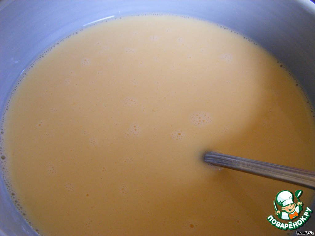 Просеять муку и смешать с разрыхлителем. Добавить яйца и молоко, взбить миксером, тесто оставить на 5 минут.