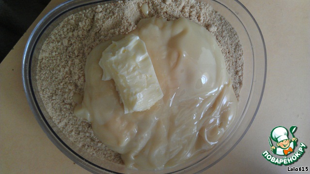 В наше перетертое печенье вводим сгущенное молоко и сливочное масло. Тщательно перемешиваем.