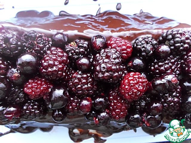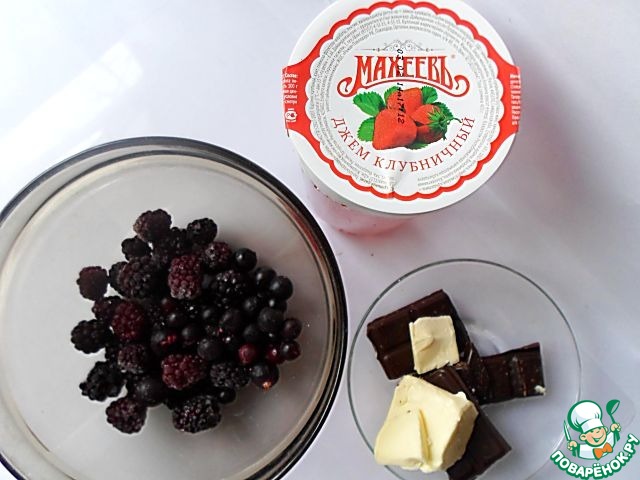 Пока остывает бисквит, я поставила размораживать ягоды. Сейчас, конечно, не лето, но здесь лучше подойдут свежие ягоды - они не дадут сок при разморозке. В оригинале была голубика, я заменила на свою любимую ежевику (90 г) и смородину (30 г). Для глазури берем шоколад и сливочное масло. Джем нагреваем в кастрюльке на тихом огне до горячего состояния. Кипятить не надо.