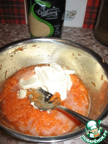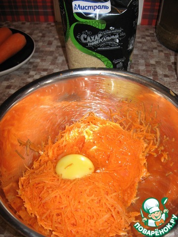 Морковь натираем на мелкой терке, добавляем яйца и коричневый сахар "Мистраль", перемешиваем и оставляем на 5 минут, чтобы морковь пустила сок