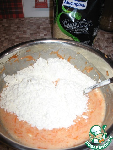 Теперь добавляем муку и разрыхлитель, вымешиваем до гладкости