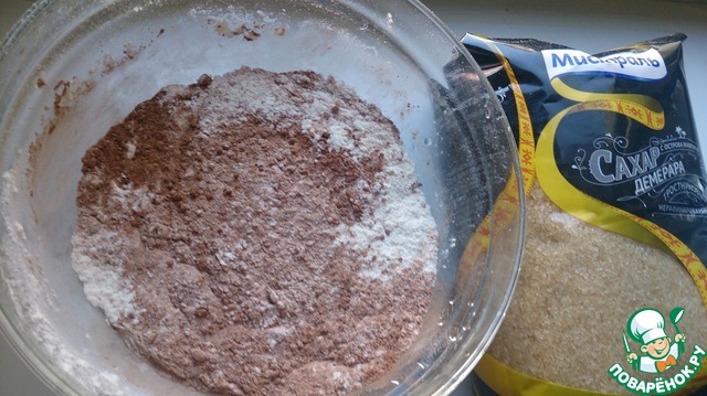 В миске смешать сухие ингредиенты. Муку, какао, разрыхлитель, тростниковый сахар. Ввести растопленное сливочное масло, яйцо. Кофе залить кипятком, добавить к полученной массе. Хорошо перемешать.