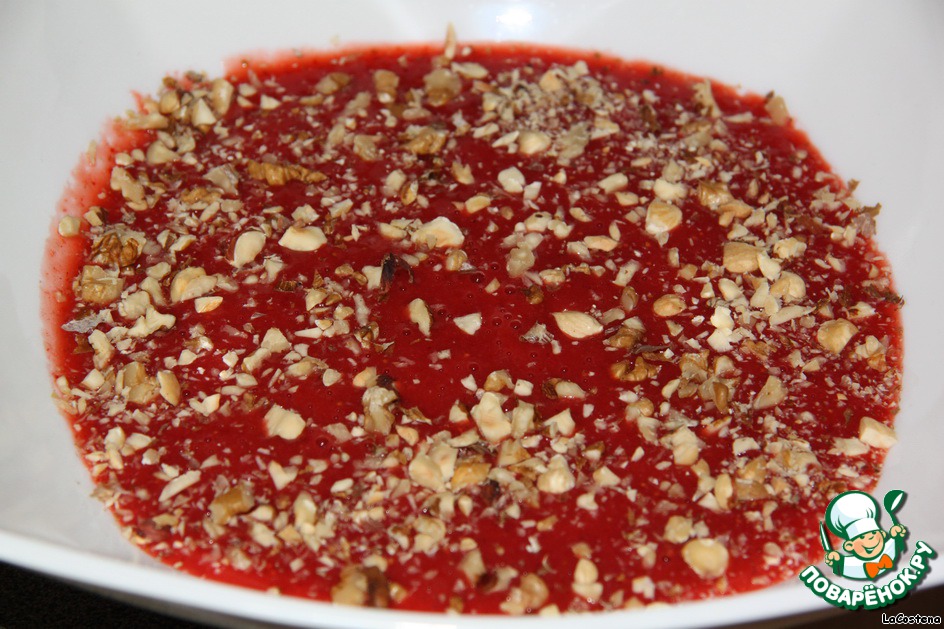 Мелко рубим фундук и грецкие орехи и посыпаем суп.