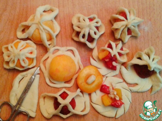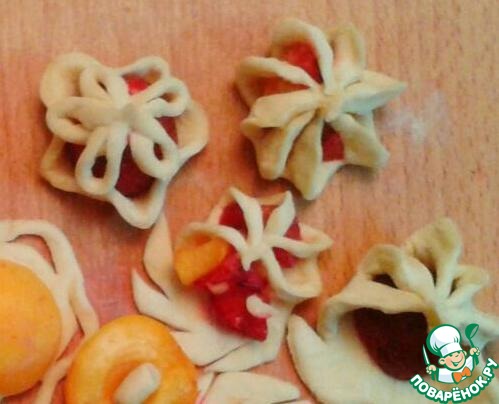Тесто раскатать толщиной 3-4мм. Вырезать кружочки. Маникюрными ножницами делаем надсечки. 1) складывая диск пополам надрезаем с двух сторон. Складываем еще два раза и снова надрезаем. Надрезов можно делать: 3, 5, 6. 2) Сделать надрезы по кругу. Собрать в пучок над начинкой. Изделия смазать яйцом. Выпекать при t 180° С 12-15 минут.