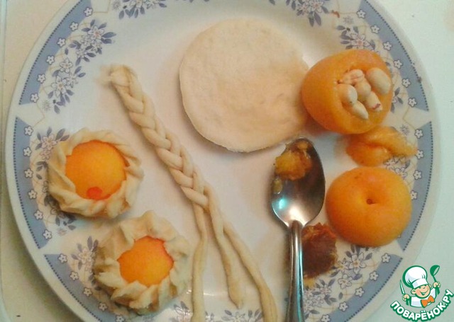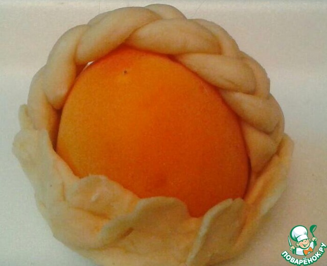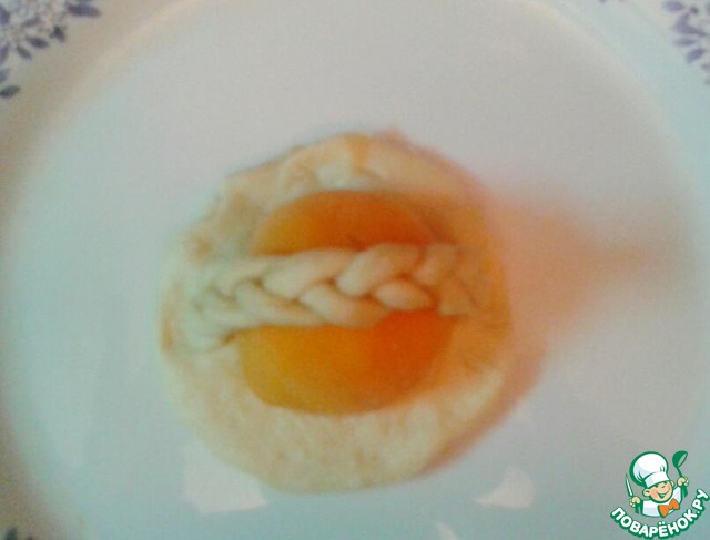 На диск из теста кладем начиненный абрикос. На него выкладываем "косичку" из теста. Прижимаем ее с двух сторон к донышку.