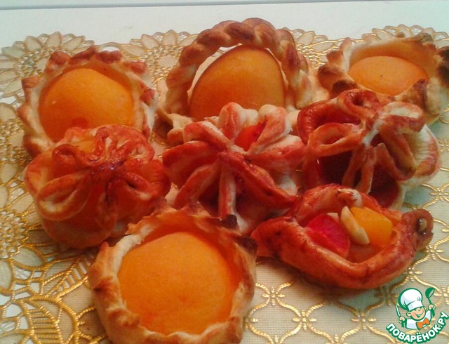 | Дорогие поварята! Сейчас много ягод, цитрусовых, фруктов... Предлагаю вам испечь слоеное тесто с клубникой и абрикосом. |