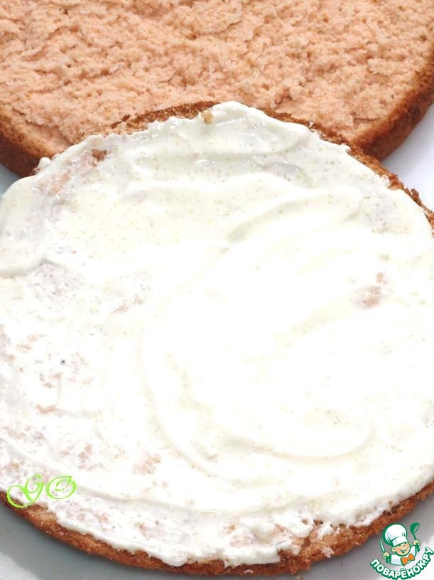 Разрезаем бисквит на два или три коржа. Смешиваем сметану с сахаром и смазываем коржи. Можно пропитать и сиропом. Оставляем коржи пропитываться. У нас остается 1/2 часть сметаны.