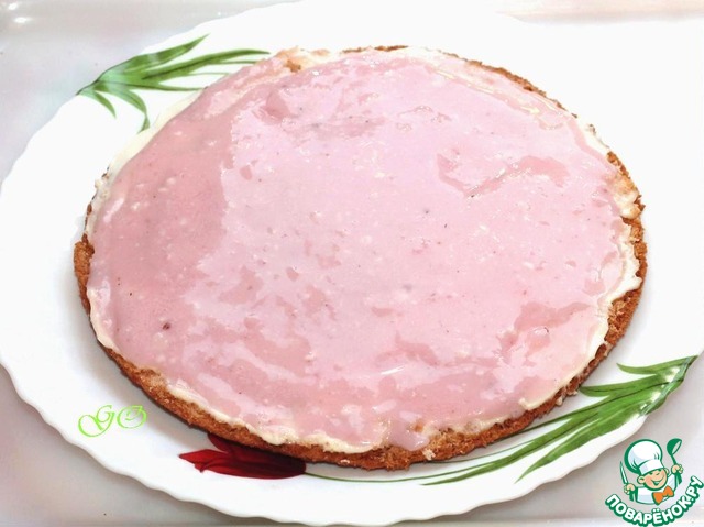 Смазываем сметано ягодной смесью нижний корж. Даем немного застыть