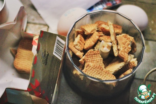 Печенье измельчаем в блендере в крошку, растапливаем масло и все перемешиваем. Выложить эту смесь на основу (предварительно смазать основу сливочным маслом), хорошо утрамбовать стаканом.