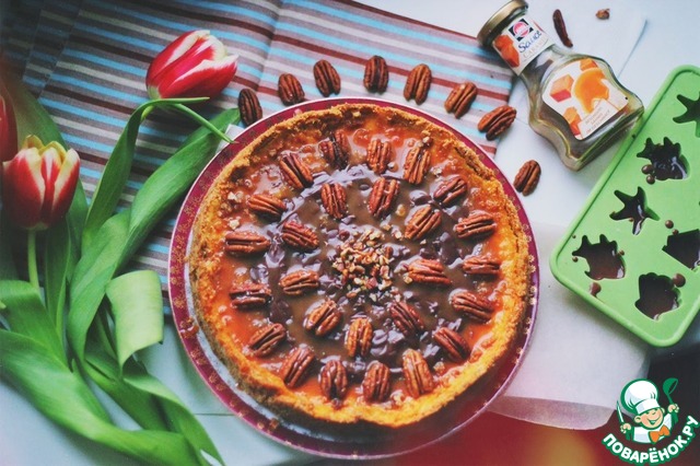 На след. день я достала чизкейк и полила его карамельным соусом. Далее я растопила шоколад и полила им вверх тортика, далее нужно выложить пеканы. Все! Чизкейк готов! ПРИЯТНОГО АППЕТИТА!