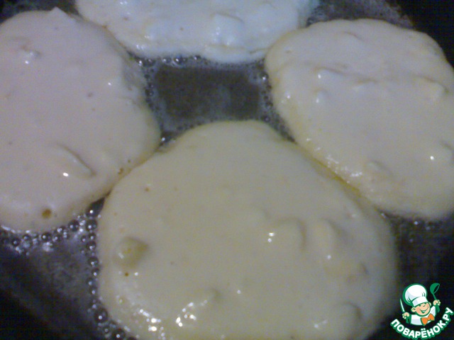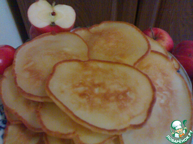Смешать:молоко,сметану,яйцо,сахар,ваниль,замороженные яблоки,мука, все перемешать и добавить соду гашеную уксусом. У меня в оладушках замороженные яблоки.