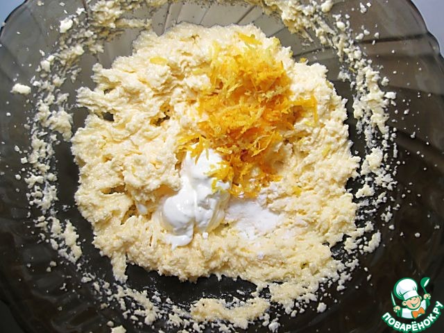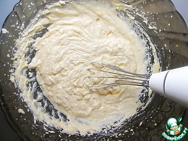 Рецепт из блога Нины Niksya. Первым делом, взбейте миксером яичные желтки с солью и сахарной пудрой до белой пышной массы, добавьте сливочное масло, ванилин и оба вида цедры, еще раз взбейте.