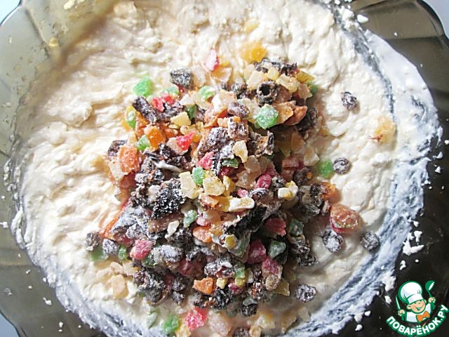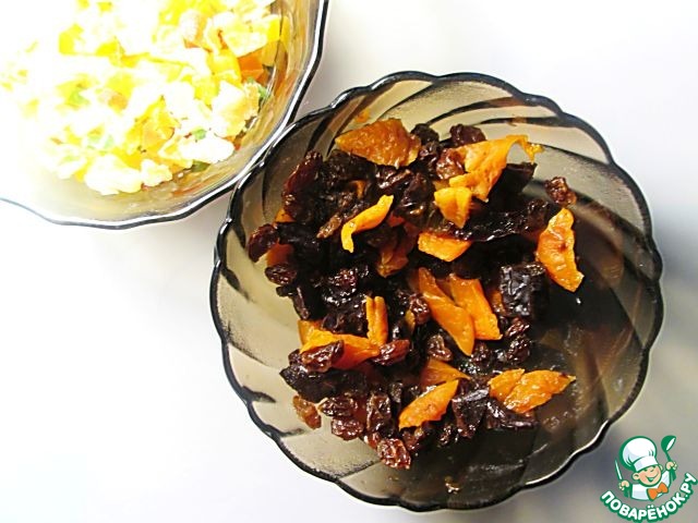 Если используете цукаты, порежьте их, если сухофрукты, промойте, порежьте крупные и оставьте мелкие как есть и замочите в алкоголе, соке или сиропе на 30 минут. Я использовала и то, и другое. На мой взгляд, ассорти из сухофруктов подходит куда больше, чем цукаты.