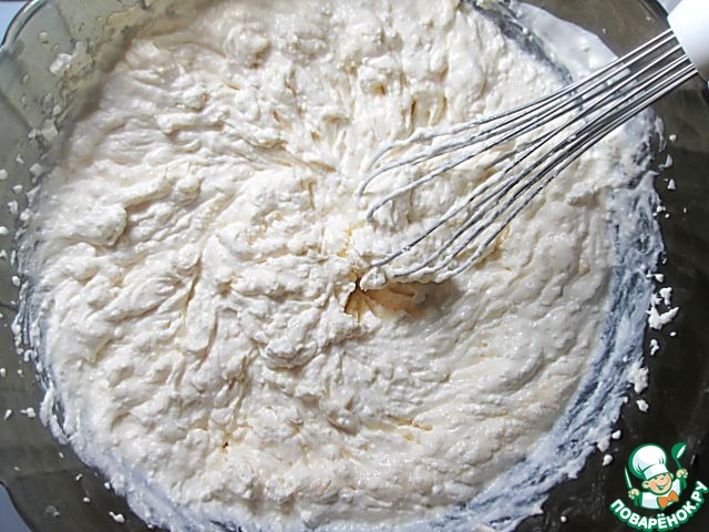 Цукаты перемешайте с крахмалом, соедините с творожной массой. Взбейте в крепкую пену белок и аккуратно подмешайте к начинке.