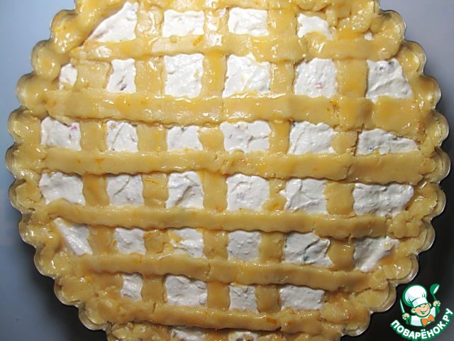 Распределите творожную начинку ровным слоем по песочному коржу, украсьте сверху полосочками из теста, смажьте тесто желтком. Поставьте на 45 минут в разогретую до 200 градусов Цельсия духовку до зарумянивания. Подавайте в горячем или холодном виде, мне больше понравилось в холодном.