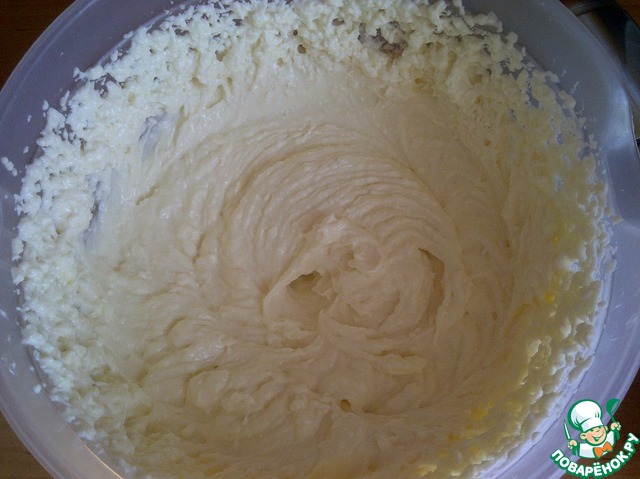 Соединить творожную массу со взбитыми яйцами. Всё вместе смешать миксером.