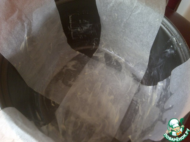 Чашу мультиварки смазать маслом сливочным. Выложить крест на крест на дно широкие полоски из пекарской бумаги и их тоже смазать маслом, что бы потом было удобно доставать запеканку. Перевернуть её на чашу пароварки не получится из за сметанно-ягодной заливки..