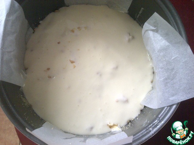 Сверху вылить оставшуюся сметанную заливку. И слгка размешать по кругу. Аккуратно, не смешайте крошки со сметаной!