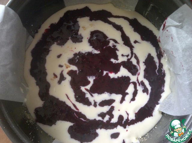 На сметанную заливку вылить в произвольном порядке смородиновое пюре.