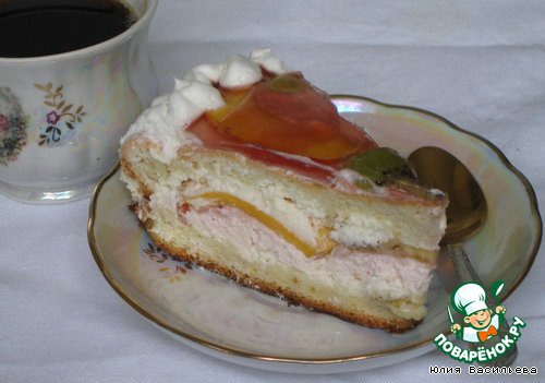 Остается только украсить наш "шедевр". Я использовала опять же взбитые сливки, фрукты и желатин, растворенный в клубничном соке. Сначала следует уложить фрукты, сверху залить "желатиновым соком" и украсить сливками.