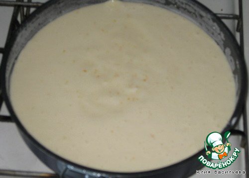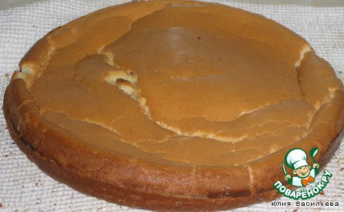 Получившееся тесто переливаем в подготовленную форму и ставим в разогретую духовку на 20-25 минут (температура 175-180 градусов). Готовность коржа проверяем как всегда: спичкой протыкаем корж, спичка должна быть сухая.