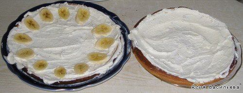 Второй корж с одной стороны тоже обмазываем взбитыми сливками и оставляем для пропитки на 10-15 минут.