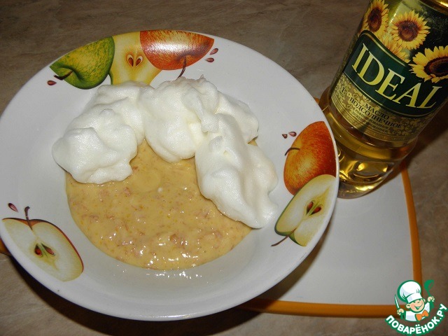 В белки добавить чуть соли и взбить до густой пены. Выложить к тесту и аккуратно перемешать (снизу вверх)