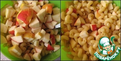 К макаронам добавить яблоки, нарезанные кубиками, и яично-молочную смесь.
