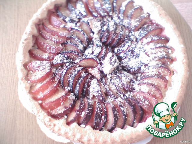 Раскатать тесто и уложить в смазанную форму, сверху разложить кусочки сливы и посыпать измельченными орехами.