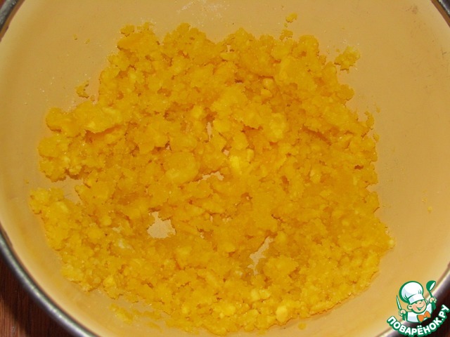 Сваренные вкрутую желтки разотрите ложкой с сахаром.