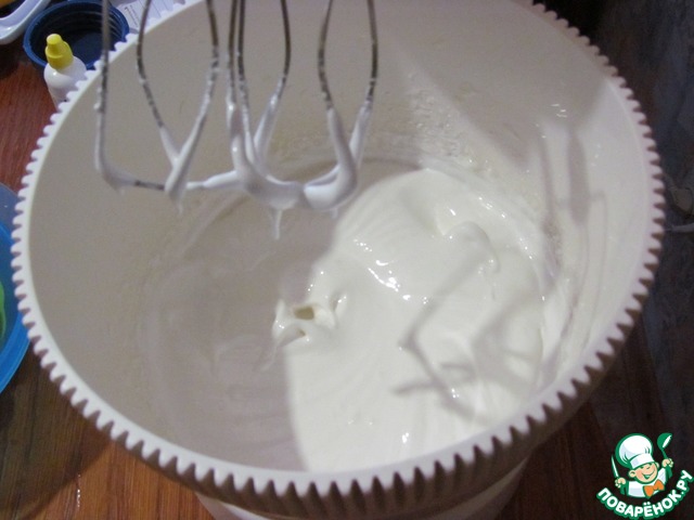 Готовим безе. Взбить белки, добавляя понемногу сахар. Взбивать до тех пор, пока масса не станет жесткой и гладкой.