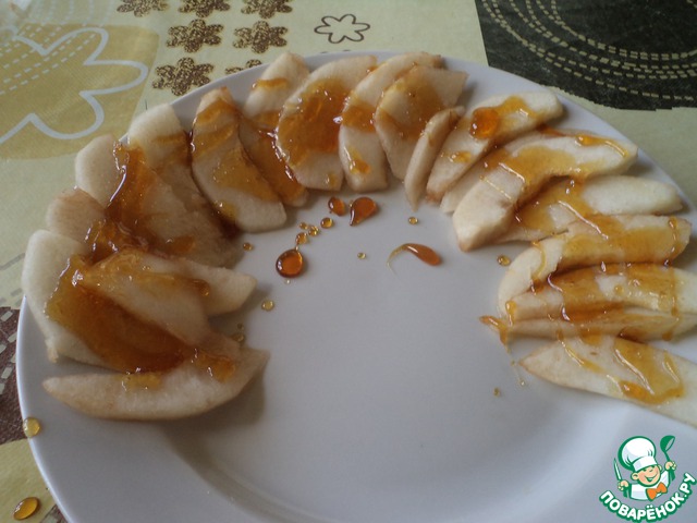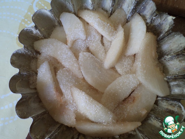 Выложите грушу на тарелку. Сварите карамель, полить грушу и верх нашего пирога.