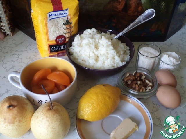 Для этого нам понадобятся мука, яйца, рис, груши, орехи, лимон, масло сливочное, сахар. Рис отварить до готовности 1:6.