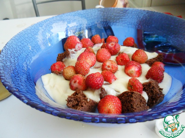 Заливаю их щедро творожно-шоколадным кремом и выкладываю по паре ложек засахаренной клубники.