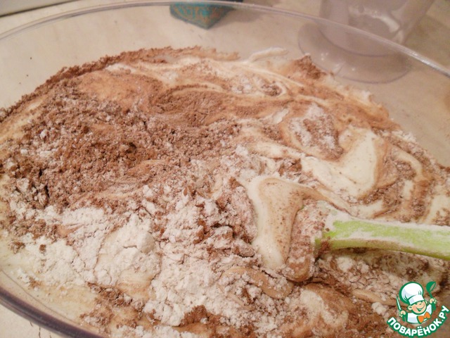 В высоком стакане взбейте яйца с сахаром, пока сахар не раствориться и масса не увеличиться в 3 раза. Вылить массу в миску и добавить просеянную муку в смеси с разрыхлителем и какао. Аккуратно ложкой замесить тесто движениями снизу вверх.